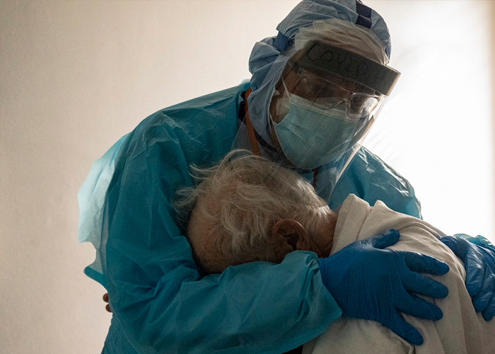 "Estaba llorando": La foto de un médico estadounidense con guantes, tapabocas y visera abrazando a un paciente anciano se volvió viral en las redes sociales, símbolo de la desesperación de las víctimas del covid-19 y la compasión de los trabajadores de la salud. Según AFP.