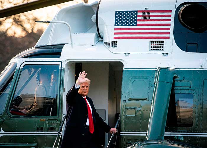 El mandatario saliente fue visto en compañía de la primera dama Melania Trump dejando la Casa Blanca para abordar el helicóptero Marine One.