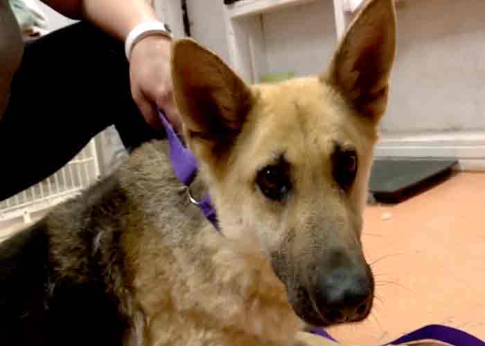 Acto seguido, el uniformado levanta al Pastor alemán con la cuerda y lo lleva hasta el automóvil, arrojándolo en su interior. En ese momento, le ordena que permanezca sentado y le golpea con la mano antes de ponerle nuevamente la correa alrededor del cuello.