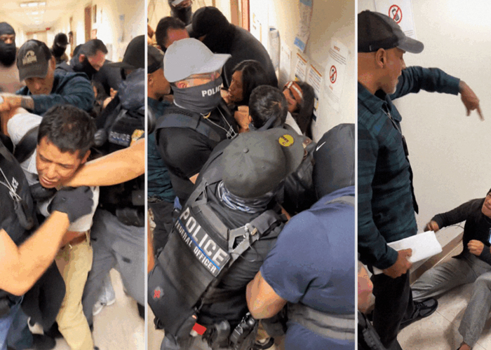 Las imágenes, captadas dentro de un tribunal de inmigración; muestran a varios funcionarios con el rostro cubierto rodeando al hombre mientras este se aferra desesperadamente a su esposa e hijos.