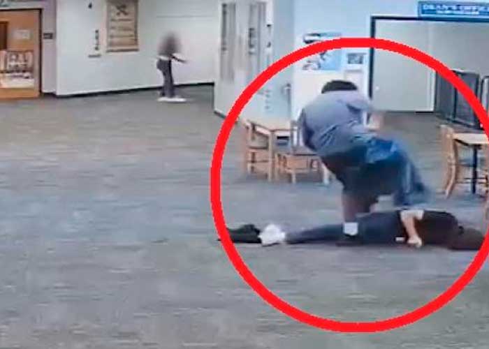 El video de vigilancia publicado por la escuela muestra a la estudiante, de casi dos metros de estatura y más de 120 kilos de peso corriendo hacia la ayudante de la maestra, empujándola al suelo y luego propinándole puñetazos y patadas.