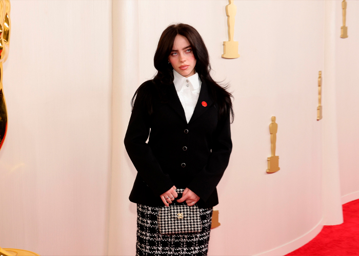 La cantante Billie Eilish, quien ganó en la categoría de mejor canción en Los Oscars; mostró un pin en la solapa de su saco en solidaridad con el pueblo palestino.