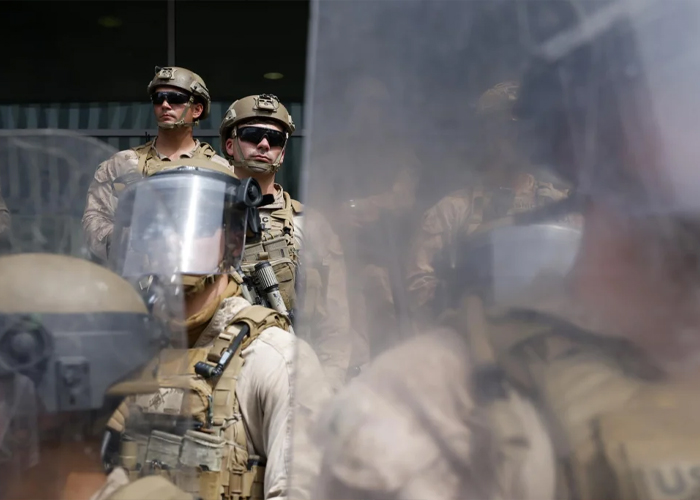 Miembros del equipo de mantenimiento de la paz de la protesta, vestidos con chalecos verdes fluorescentes, lo confrontaron con sus armas desenfundadas.