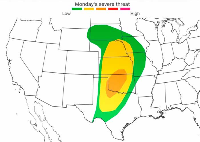 El calor inusual del fin de semana preparará la atmósfera para las tormentas destructivas, junto con una oleada de aire húmedo del Golfo de México, afectando desde Texas hasta Iowa. Se prevé un riesgo de nivel 3 de tormentas intensas desde el norte de Texas hasta el sur de Kansas el lunes, con granizo, ráfagas de viento dañinas y tornados potenciales en EE.UU.