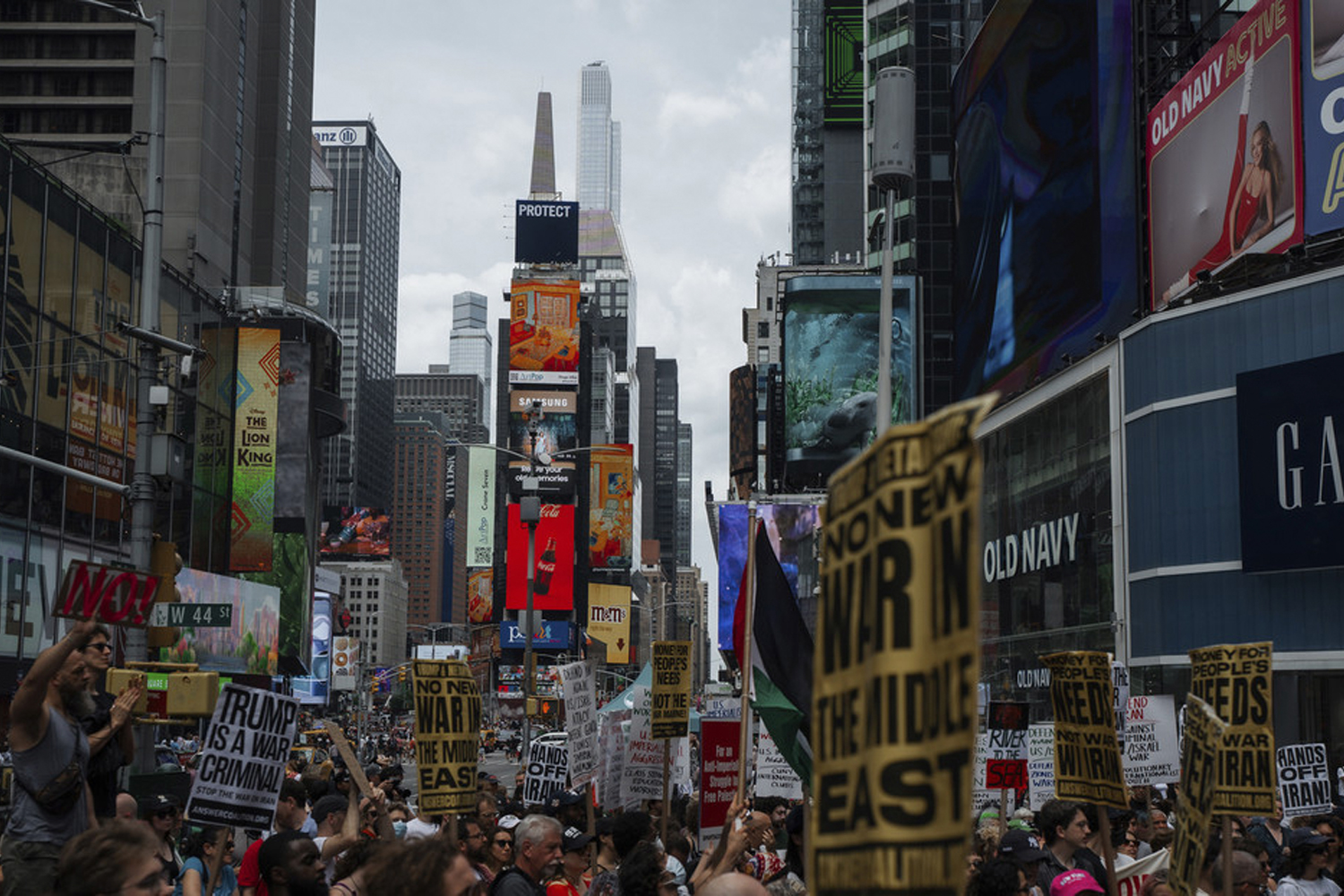 Cientos de personas se congregaron el pasado domingo en Times Square, en el corazón de Nueva York, para manifestarse contra los recientes ataques de Estados Unidos a instalaciones nucleares de Irán, según informó la agencia AP.