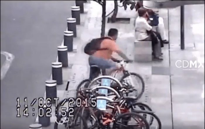 En el video se muestra cómo un hombre se acerca a una bicicleta que está amarrada en la calle 16 Septiembre esquina con Motolinia, en el centro de la Ciudad de México, y en menos de un minuto corta la cadena, se sube a la bici y se va.