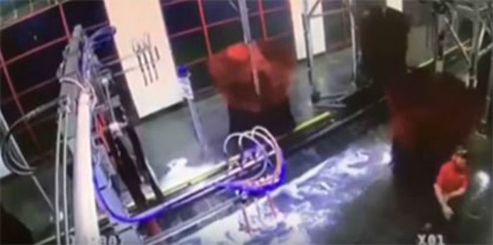 Increíblemente un empleado quedó atrapado en uno de los rodillos de un centro de lavado automático de autos cuando se encontraba realizando la manipulación de una manguera cerca del sistema de rodillos.