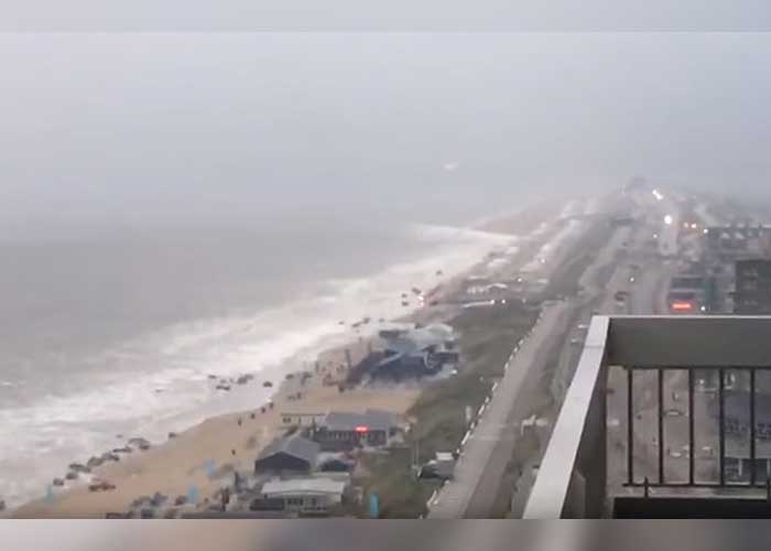 Las imágenes del impactante fenómeno, captadas por un testigo, muestran cómo olas gigantes del Mar del Norte 'devoran' una zona de la playa con sillas, botes y sombrillas. Según los datos de medios locales, el fenómeno no dejó heridos.
