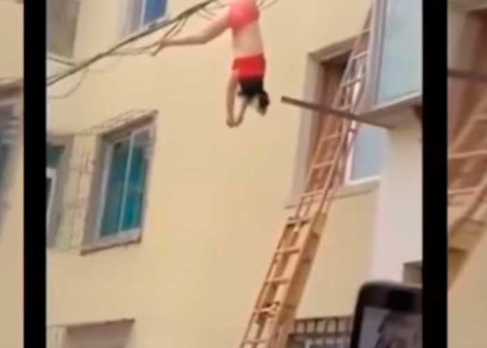 Una mujer casi desnuda fue grabada colgando de varios cables de electricidad en China, luego de que tratara de huir del departamento de su amante ante la llegada de la pareja de este.