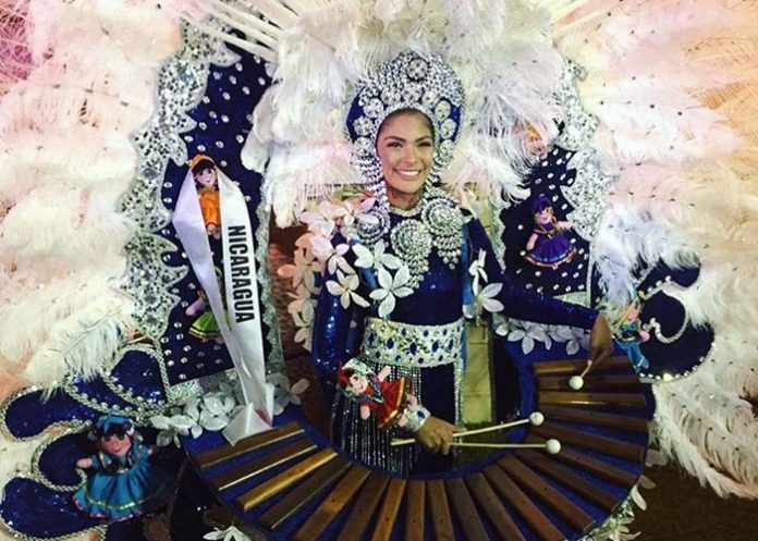 “Es un diseño muy bonito. En él utilicé varias telas con mucha lentejuela, piedras, y plumas. Decidí incorporar muñecas de Masaya, para no olvidar la cuna de nuestro folklore. Y lo más difícil, sin duda, (fue incorporar) el diseño de la marimba… son teclas de madera originales, así que creo que es un diseño completo, muy original y sobre todo que representa excelente a Nicaragua”, nos compartió el diseñador nica.