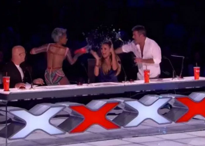 Al escuchar el agresivo comentario, la ex integrante de las Spice Girl tomó un vaso de agua y se lo tiró encima a su compañero de trabajo antes de abandonar el estudio en medio del show. En el medio, la top model Heidi Klum aplaudía la reacción de la cantante.