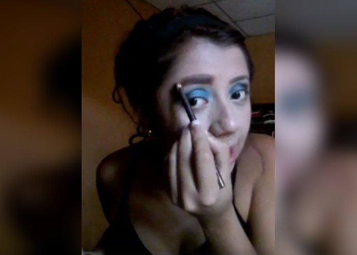 Al principio, podemos verle con el rostro limpio. Ella comienza interactuando con sus seguidores. Cuando logró alcanzar los 100 espectadores comenzó a aplicarse la base (la cual era de un tono mucho más claro que su rostro)