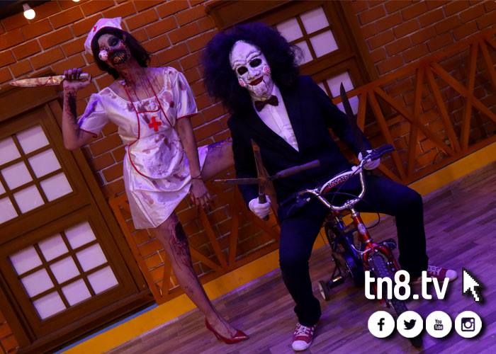 Cindy Bustamente con inspiración y trabajo artístico de Mynor Dávila, quienes se inspiraron en la película The Walking Dead para darle vida a una enfermera zombie y Che Gerardo con un maquillaje de Adeline Obando, juntos recrearon al icónico muñeco de la película Saw, Jigsaw.
