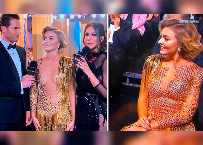 Angelique Boyer llegó a la alfombra azul de los premios de Las Estrellas de la mano de su novio, luciendo un vestido dorado con un impresionante escote, sin embargo el atuendo estaba al revés.