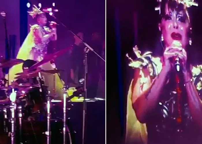 Mientras entonaba el verso “Soñar no cuesta no, y con los ojos húmedos…Te veía tan alto, es más, en la cima del mundo”, su voz se quebró y ocultó sus lágrimas entre sus manos, mientras su público la alentaba a continuar.