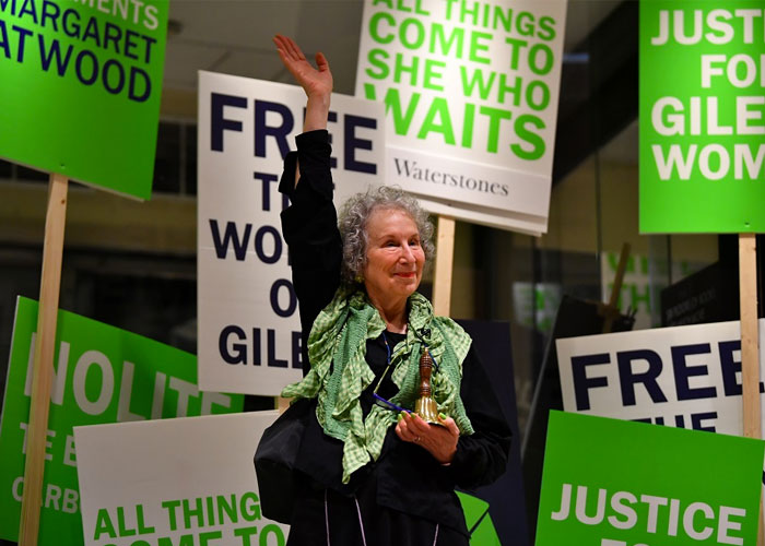 Cuando llegó la medianoche, Margaret Atwood leyó fragmentos de su nueva obra, de pie sobre una tarima, en la librería Waterstones. A su alrededor toda una puesta en escena: criadas vestidas de rojo con sombreros blancos y carteles.