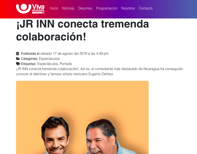 Los colegas titularon la nota: “JR INN conecta tremenda colaboración” y dieron por hecho que “el comediante más destacado de Nicaragua ha conseguido conocer al talentoso y famoso artista mexicano Eugenio Derbez”, agregando una fotografía en la que se ve a Eugenio junto a JR.