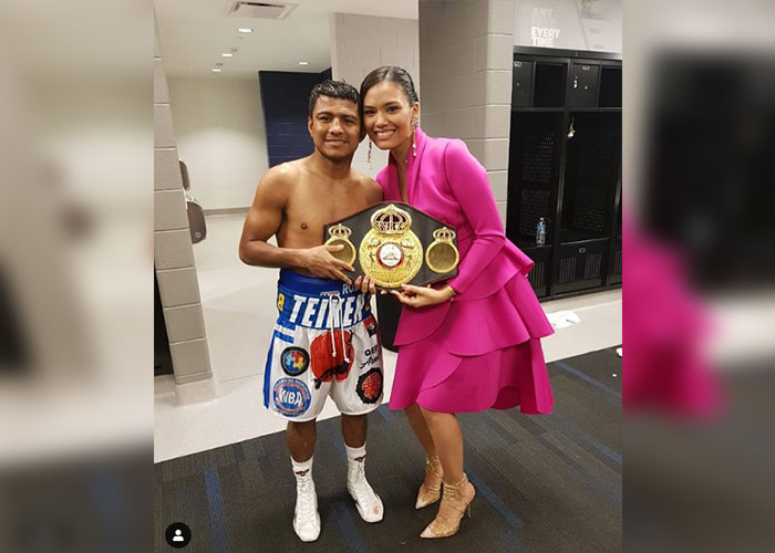 La presentadora de televisión que lucía un espectacular vestido color fucsia no dejó de gritar y tirarle besos a Román, quien se alzó con el título de las 115 libras de la Asociación Mundial de Boxeo.