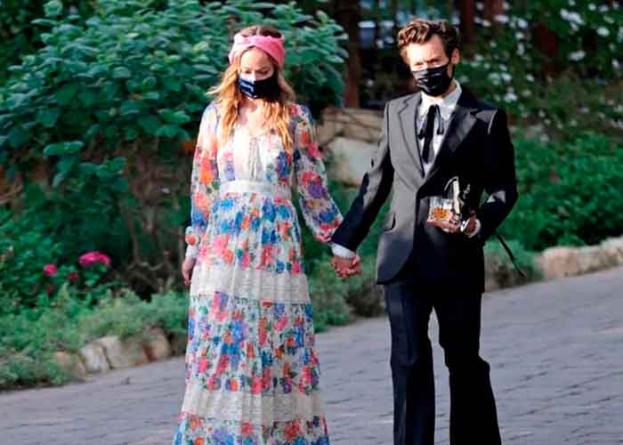 Asimismo, durante la boda de Jeff Azoff (el agente de Harry) en California, se ve a la pareja tomados de la mano con una vestimenta elegante y portando un cubrebocas negro. En otra fotografía de Page Six se ve a Harry vistiendo una bata blanca mientras conversa con los novios.