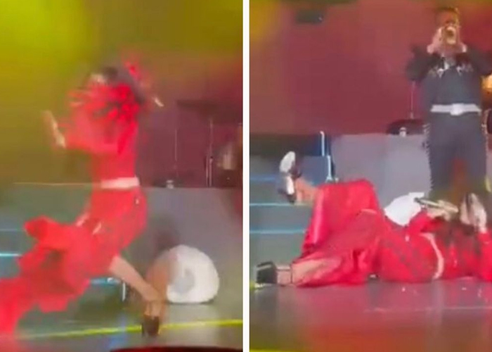 Sin embargo, presentar su concierto de una manera tan “extravagante” le pasó factura. La también compositora y actriz tenía unos tacones considerablemente altos y en medio de uno de los pasos que estaba realizando el zapato se enredó con su pantalón, por lo que terminó en el suelo.