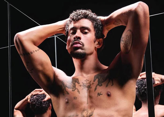 El intérprete de 31 años posó sin camiseta, modelando calzoncillos en colores blanco y negro y luciendo sus famosos tatuajes.