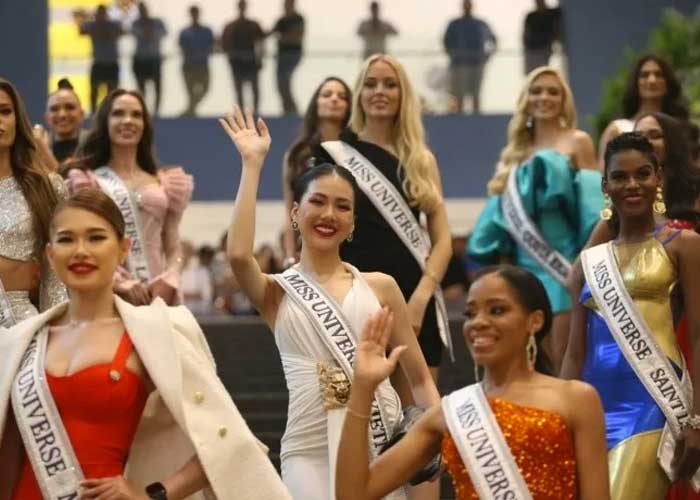 Un grupo de aspirantes a Miss Universo 2023 saludaron y se tomaron fotografías con salvadoreños que llegaron el pasado martes a un centro comercial cercano a la capital, donde las candidatas también desfilaron para los cientos de asistentes.