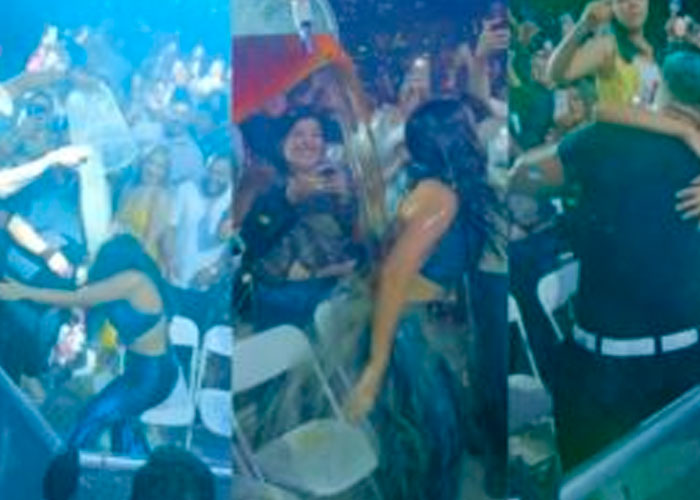 Así mismo, la madre de sus hijos se encontraba en las primeras filas disfrutando de dicho evento; cuando minutos más tardes toda la agrupación, de manera repentina se bajaron de la tarima y corrieron rápidamente a donde ella estaba para bañarla con bebidas.
