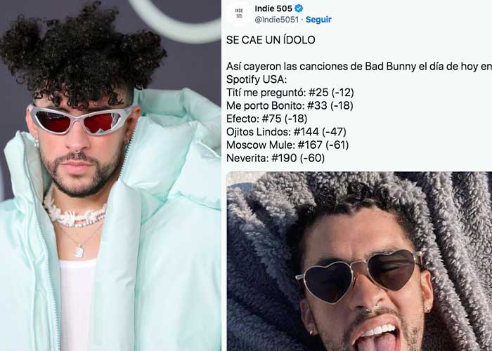 Por ejemplo, “Tití me preguntó” cayó del puesto 13 al 25; “Me porto bonito” cayó 18 puestos, del puesto 15 al 33; “Efecto” se encuentra ahora en el puesto 75, habiendo caído 18 puestos. El tema “Ojitos lindos” se desplazó del puesto 97 al 144; “Moscow Mule” cayó 61 puestos, ahora se encuentra en el número 167; y “Neverita” cayó 60 puestos, ahora está en el lugar 190.
