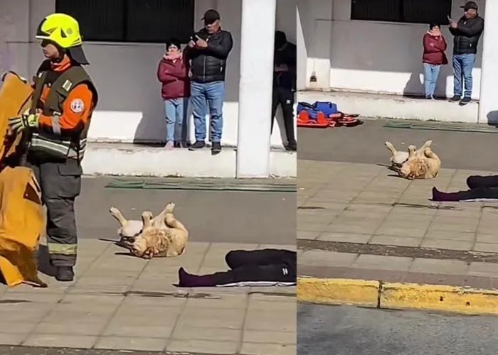 La descripción del video revela: “Durante la simulación de accidente, el inesperado protagonista fue nuestro amigo de cuatro patas”.