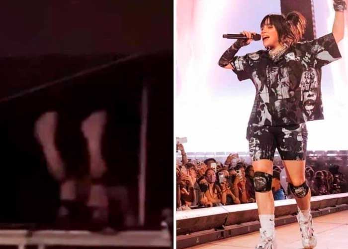«Acabo de irme de hocico»; gritó por el micrófono. «¡Ouch! Chicos, acabo de irme de cu** en el escenario». Continuó diciendo estoy bien… Estaba oscuro. ¡Ouch! Me tropecé con la maldita cosa de fuego. Luego se vio a Eilish sacudiendo su mano por el dolor, gritando: Ouch de nuevo.