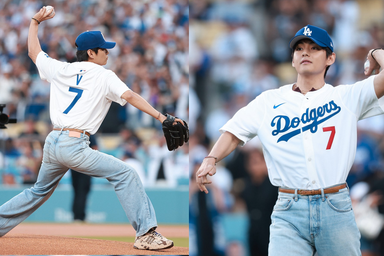 El esperado instante llegó cuando V subió al montículo vistiendo una camiseta número 7 y jeans desgastados. Saludó brevemente al lanzador de los Dodgers, Yoshinobu Yamamoto, y con su mano izquierda realizó el lanzamiento ceremonial.