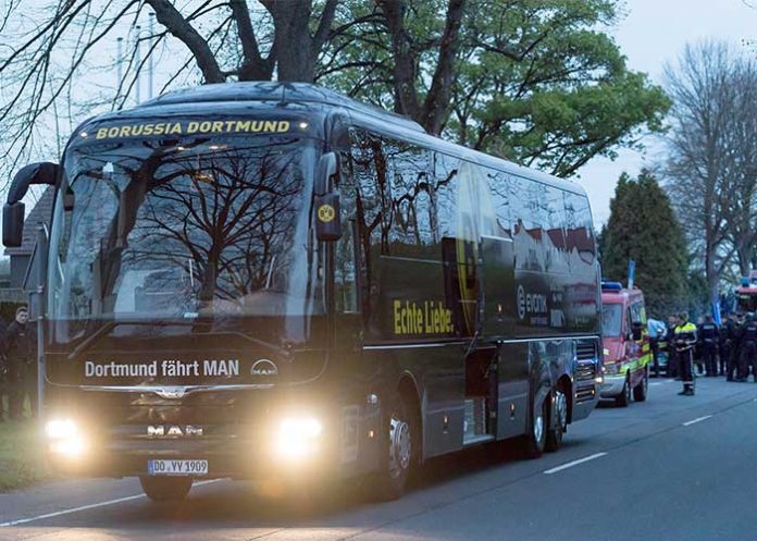 El autobús de los jugadores del Borussia Dortmund fue alcanzado por tres explosiones este martes y el español Marc Bartra resultó herido en un brazo, lo que provocó el aplazamiento al miércoles del partido de cuartos de final de la Liga de Campeones ante el Mónaco.