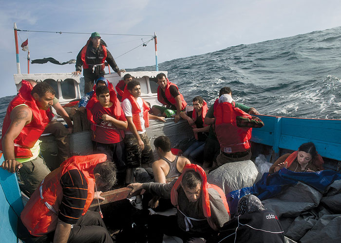 MOAS distribuyó una imagen en Twitter en la que se ve a numerosas personas en el agua durante la operación de rescate con el comentario: "No es una escena de una película de terror… Tragedia real que se desarrolla hoy a las puertas de Europa".