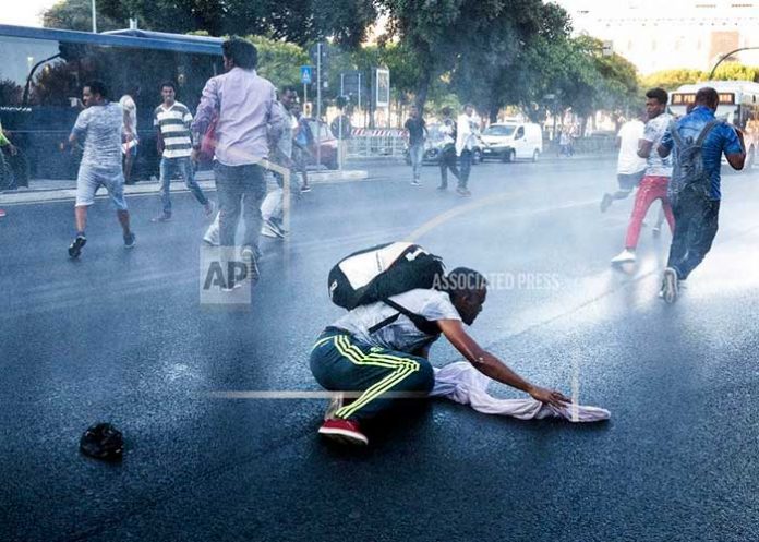 MILÁN (AP) — Migrantes lanzaron piedras, botellas y botellas de gas a policías antimotines durante el desalojo el jueves de una plaza de Roma que había sido ocupada en 2013.