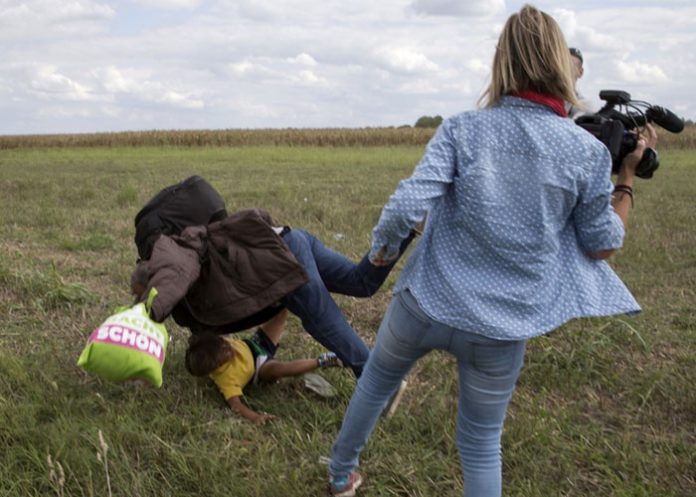 La periodista húngara Petra László, que entonces colaboraba con la televisión local N1, cercana al partido de extrema derecha Jobbik, fue filmada en septiembre de 2015 en el momento que agredía a los refugiados.