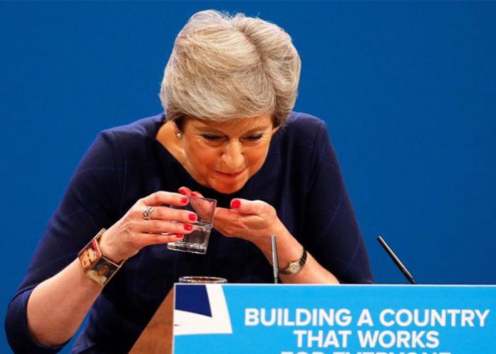 La primera ministra británica Theresa May sufrió un ataque de tos en pleno discurso en #Manchester pic.twitter.com/X6t2aAGypc