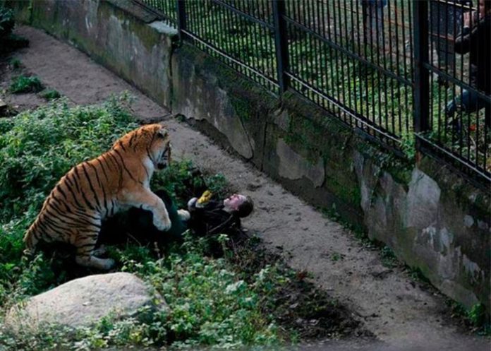 En una fotografía realizada por testigos y difundida por varios medios rusos, puede verse a la mujer tirada en el suelo y el tigre, de 15 años de edad, lanzándose sobre ella, que grita con la mirada desencajada.