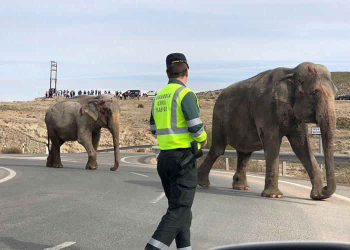 Cinco elefantes viajaban en el camión y, al registrarse el accidente, varios quedaron sueltos en la carretera mientras los heridos tuvieron que ser trasladados con una grúa debido a su peso.