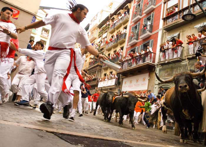 Durante una semana, cada mañana a las 08H00 cientos de 'mozos' ataviados de camisa y pantalón blancos y con un pañuelo rojo al cuello corren delante de los toros por el centro de Pamplona, después de encomendarse a la imagen de San Fermín.