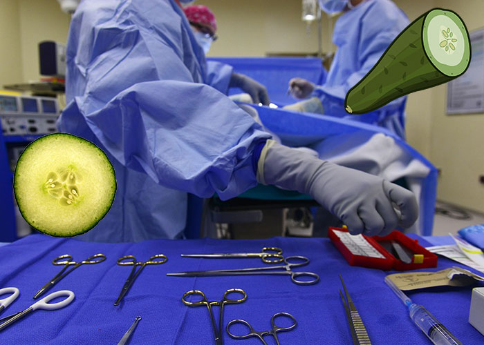 Tras una breve exploración, se procedió sin perder ni un minuto más en la extracción del recto del paciente de un pepino de casi medio kilo de peso, que era el causante de tan dolorosa situación.