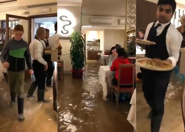 Un video grabado en una pizzería veneciana mostró la serenidad con la que los empleados y comensales afrontaban la situación, como si fuese un hecho común y corriente almorzar con el agua por encima de los tobillos.