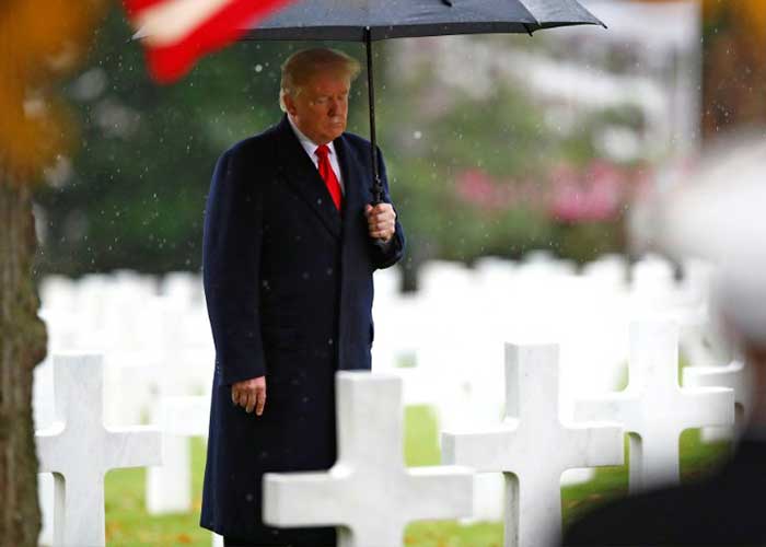 Suresnes, Francia | AFP | El presidente Donald Trump rindió homenaje a los "valientes" soldados de Estados Unidos que murieron durante la Primera Guerra Mundial, en una visita a un cementerio estadounidense al oeste de París, un día después de haber sido criticado por suspender su presencia a una ceremonia similar por la lluvia.