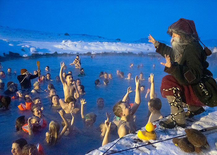 La tradición dice que se bañan una vez al año antes de Navidad. Cada año, los actores en Myvatn, una población en el borde del interior deshabitado de Islandia, visten disfraces del siglo XIX y llegan caracterizados como los Chicos de Navidad a una laguna natural alimentada por fuentes termales.