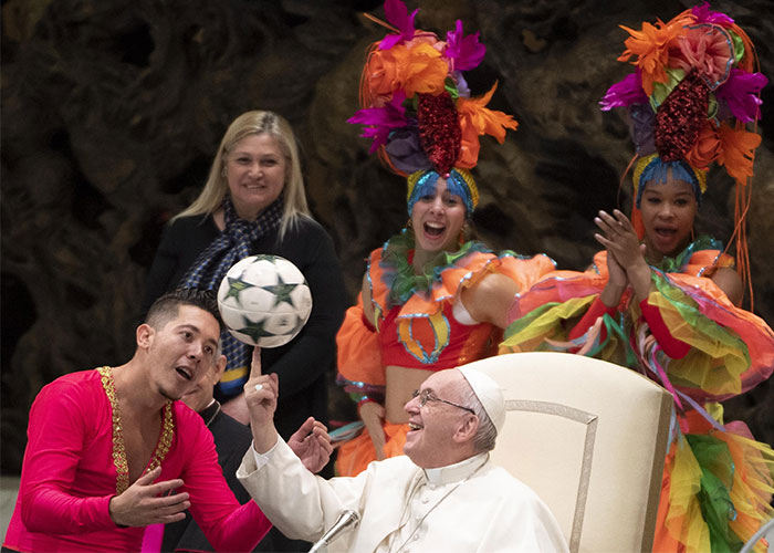 E incluso el propio pontífice llegó a implicarse, cuando uno de los artistas puso a rodar un balón sobre su dedo.