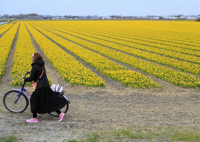 Los campos de bulbos de flores cerca de la costa de Holanda en el mar del Norte son una atracción importante para los turistas durante la primavera debido a que los tulipanes, narcisos, jacintos y otras, florecen y transforman la región en un mosaico de colores vibrantes que proporcionan un telón de fondo para tomar muchas fotografías y subirlas a las redes sociales.