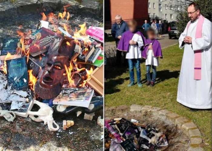 Un grupo de sacerdotes católicos polacos quemaron varios objetos que consideran contrarios al “respeto a Dios”, entre ellos libros de Harry Potter o un paraguas de Hello Kitty, en una acción para combatir la magia y los falsos ídolos, dicen sus autores.