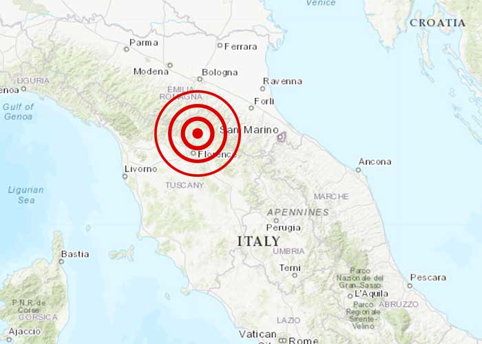 La principal sacudida, después de algunas menores, tuvo lugar a las 4.37 hora local (3.37 GMT) y su epicentro fue localizado a unos 25 kilómetros al norte de Florencia y a una profundidad de 9 kilómetros, informó el Instituto Nacional de Geofísica y Vulcanología (INGV).