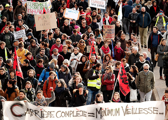 Custodiados de cerca por la policía, los manifestantes caminaron durante 4 kilómetros, pese a las bajas temperaturas, coreando sus críticas a la controvertida reforma, que temen retrasará la edad de jubilación y disminuirá el nivel de las pensiones.
