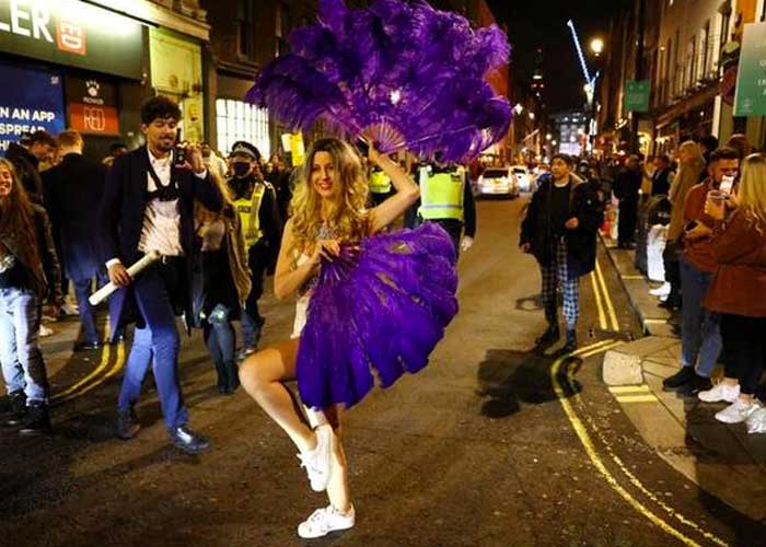 A medida que las restricciones más severas acechaban al filo de la medianoche, unos cientos de juerguistas dejaron de lado la melancolía del COVID-19 en el Soho y salieron de fiesta en las calles, en su mayoría sin mascarillas.