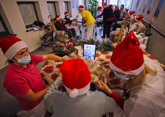 Los ancianos llevaban gorros de Santa durante las visitas virtuales de sus nietos voluntarios. También recibieron regalos para abrir durante las llamadas. La familia adoptiva de Comotti le envió un chal, como había pedido.